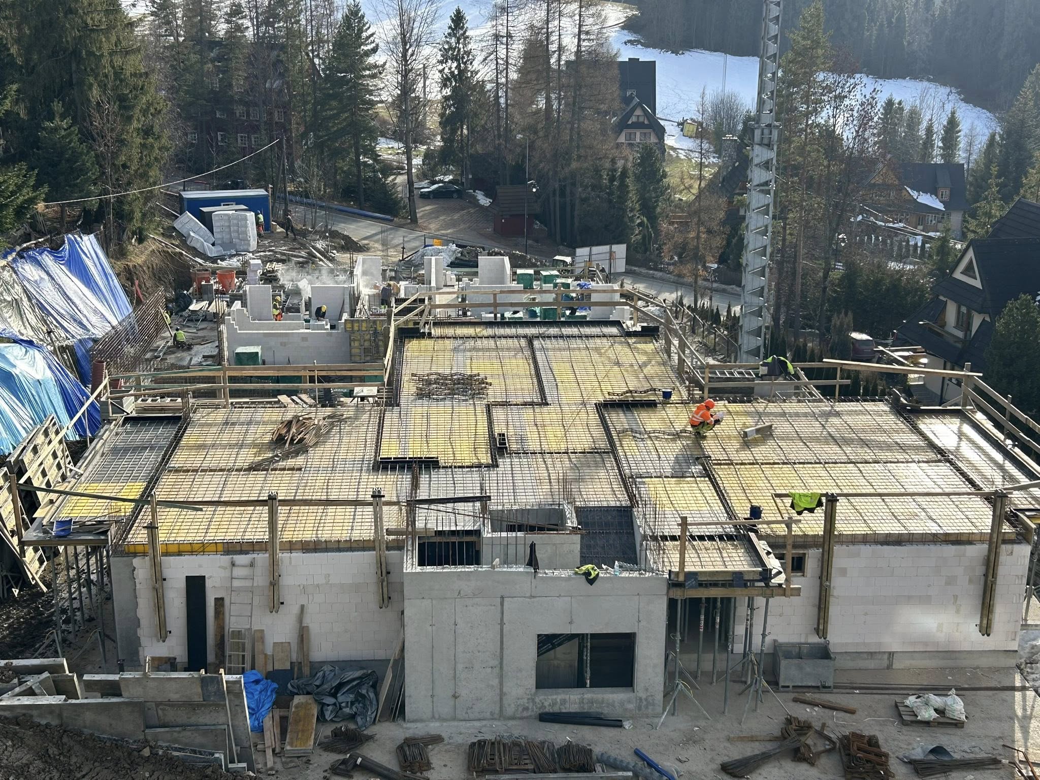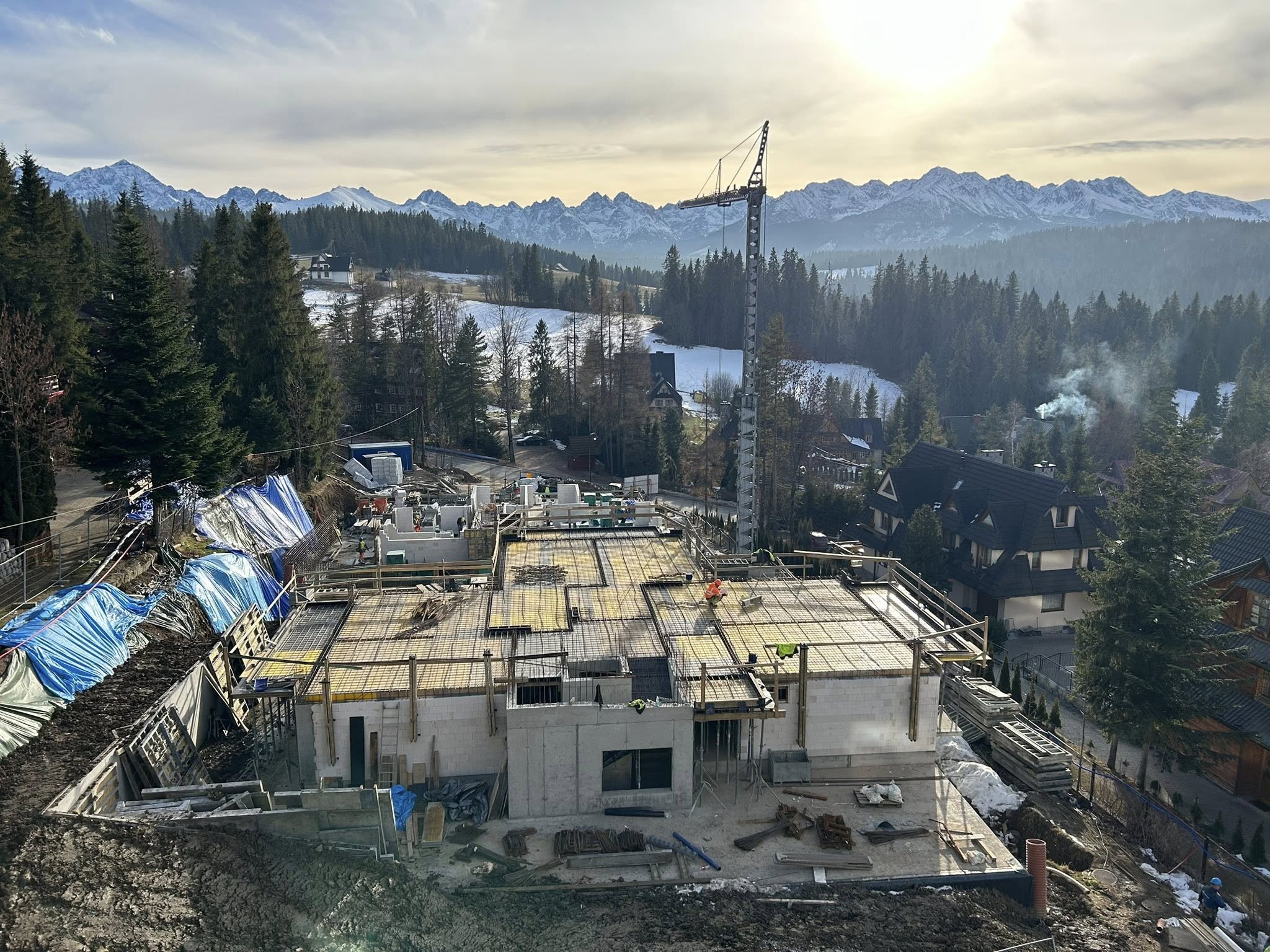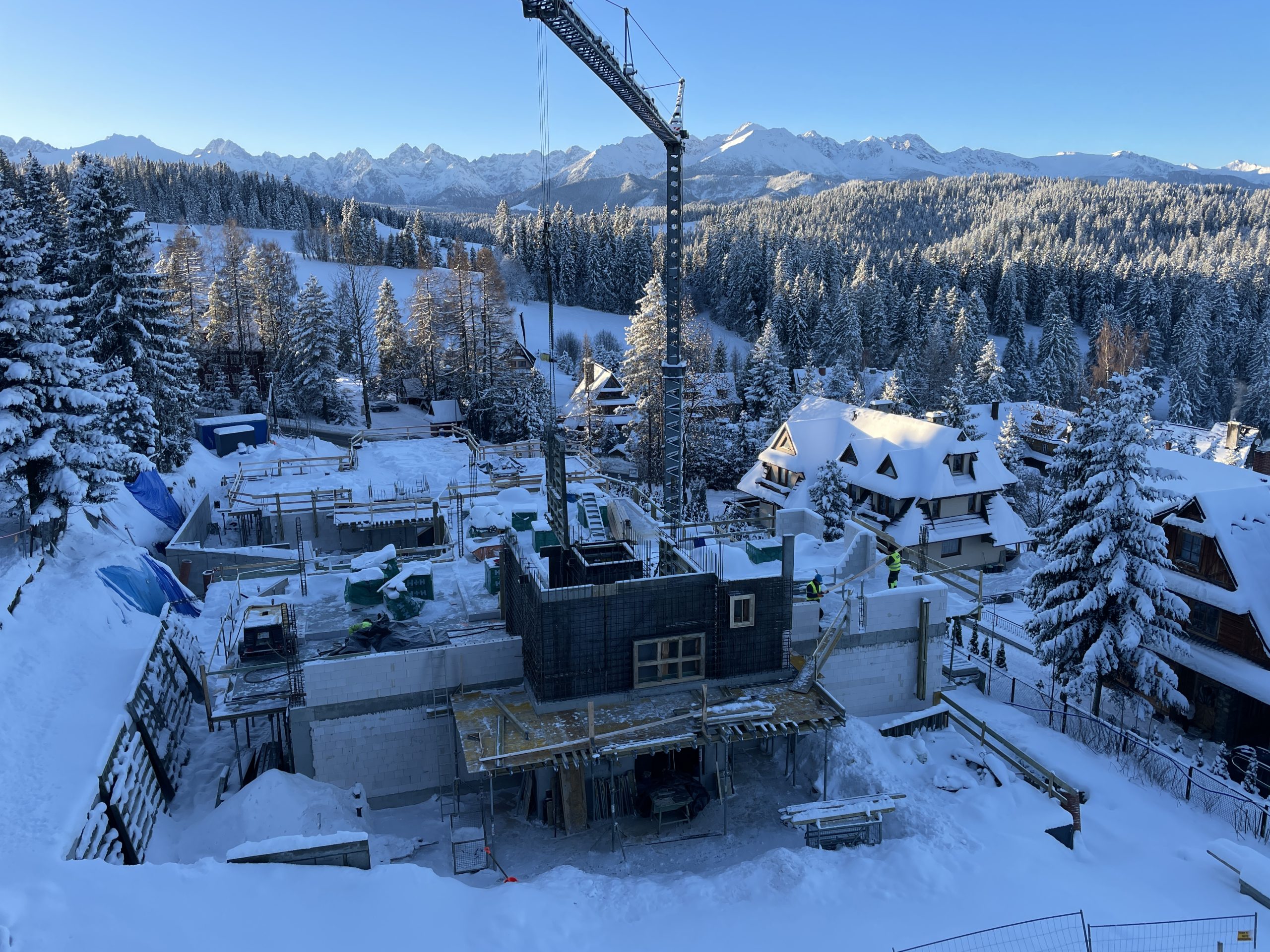 Na budowie Apartamentów Rysy widać wyraźny progres – konstrukcja pierwszego budynku dynamicznie pnie się w górę, a inwestycja coraz mocniej wpisuje się w górski krajobraz.
