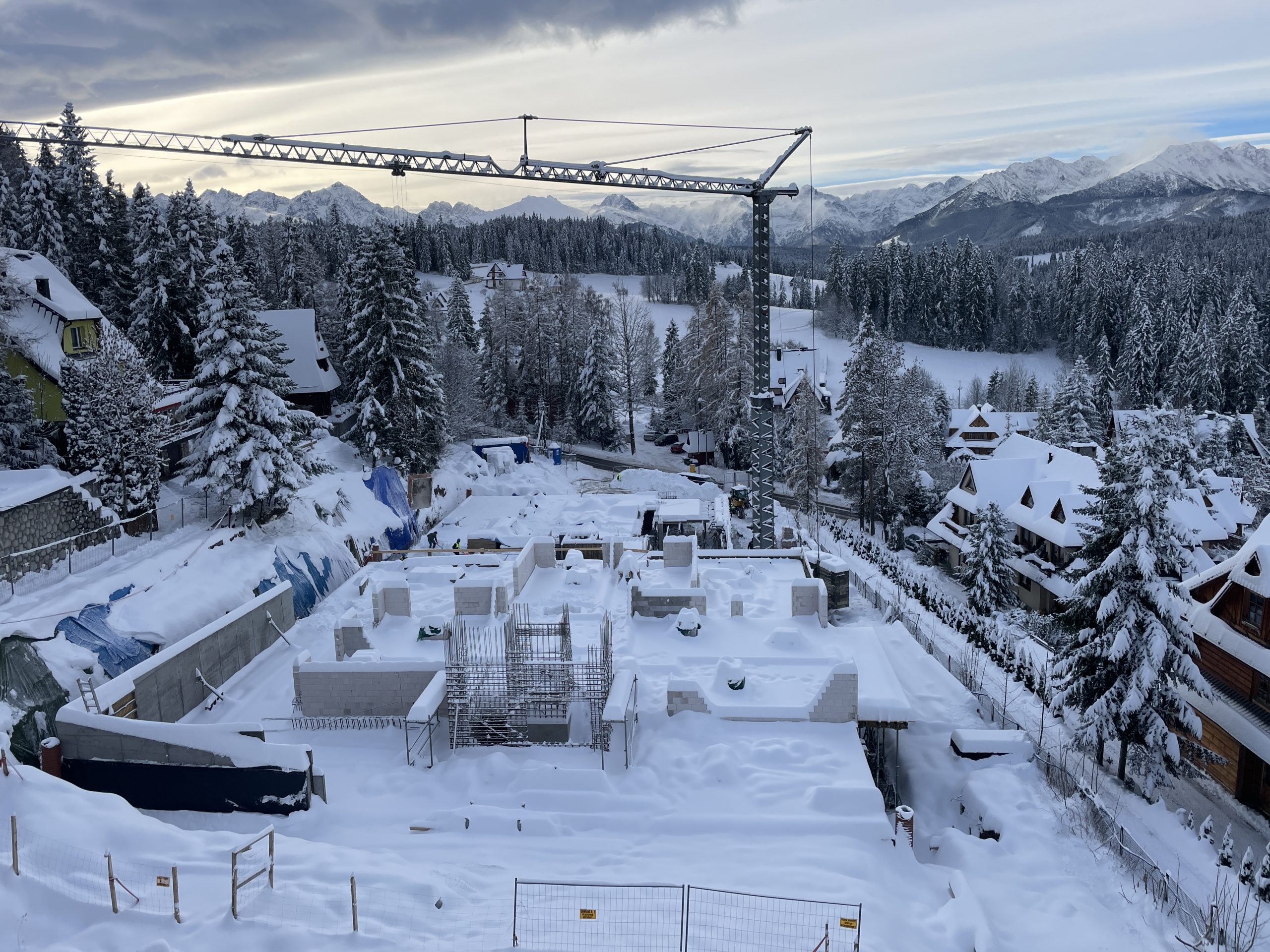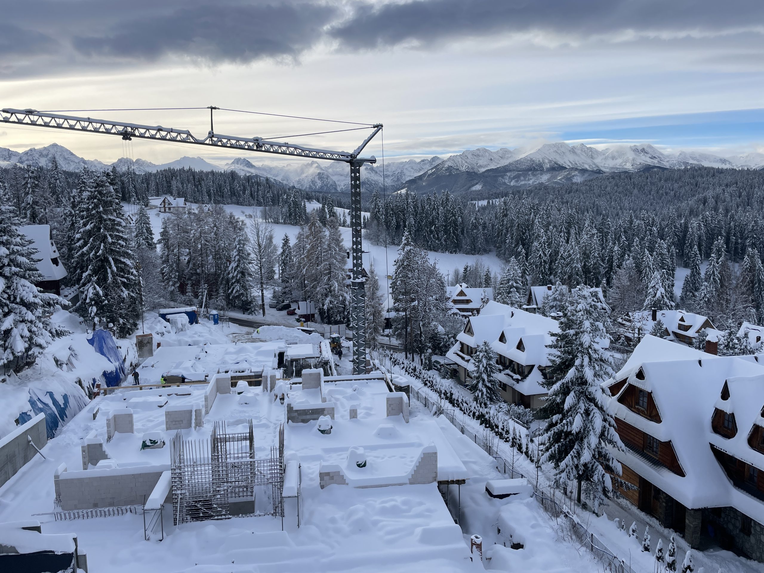 Mimo grubych warstw śniegu prace idą pełną parą: konstrukcje rosną, kolejne elementy budynku nabierają kształtu, a dźwig wyznacza kierunek, w którym rozwija się cała inwestycja.