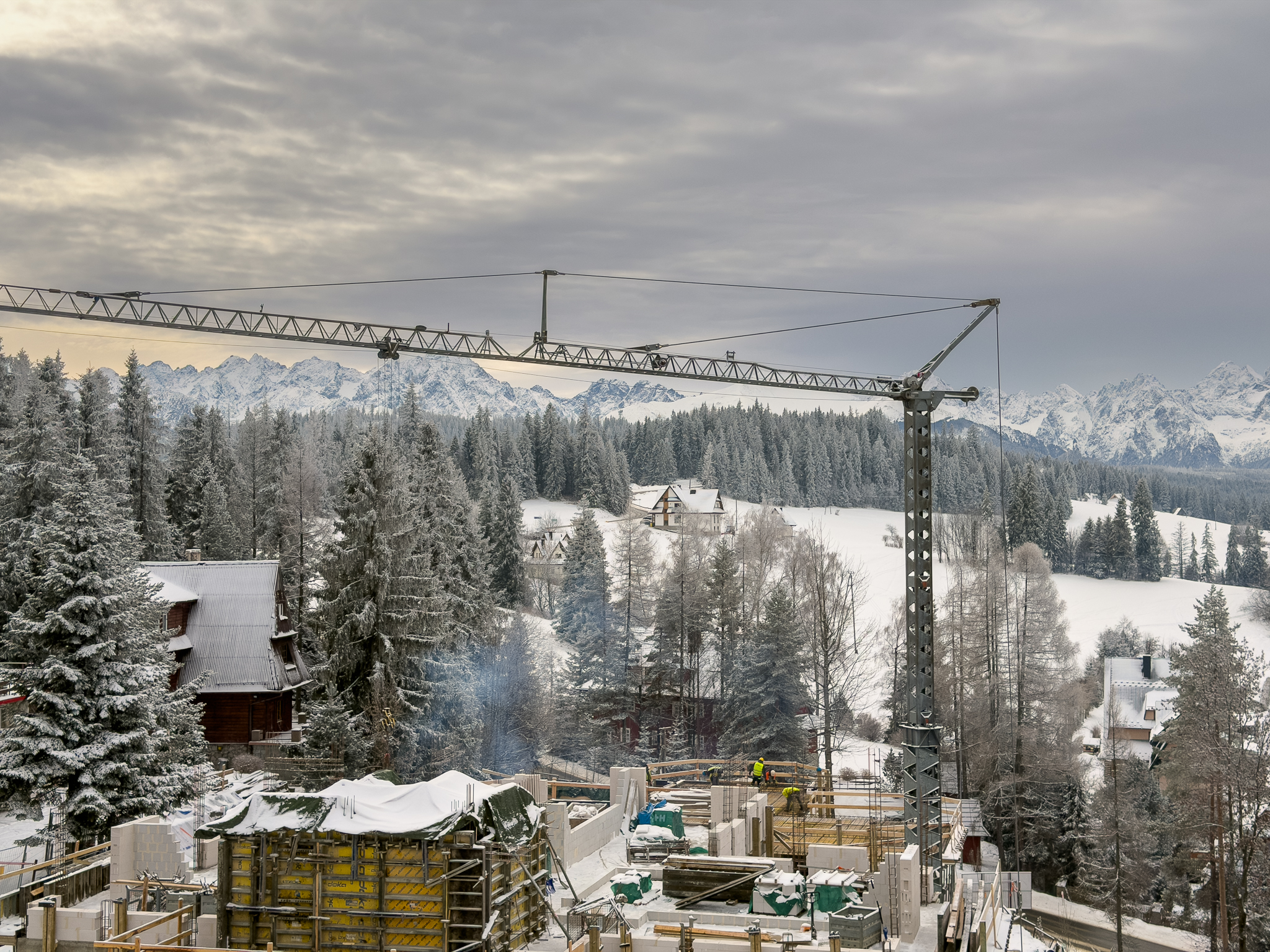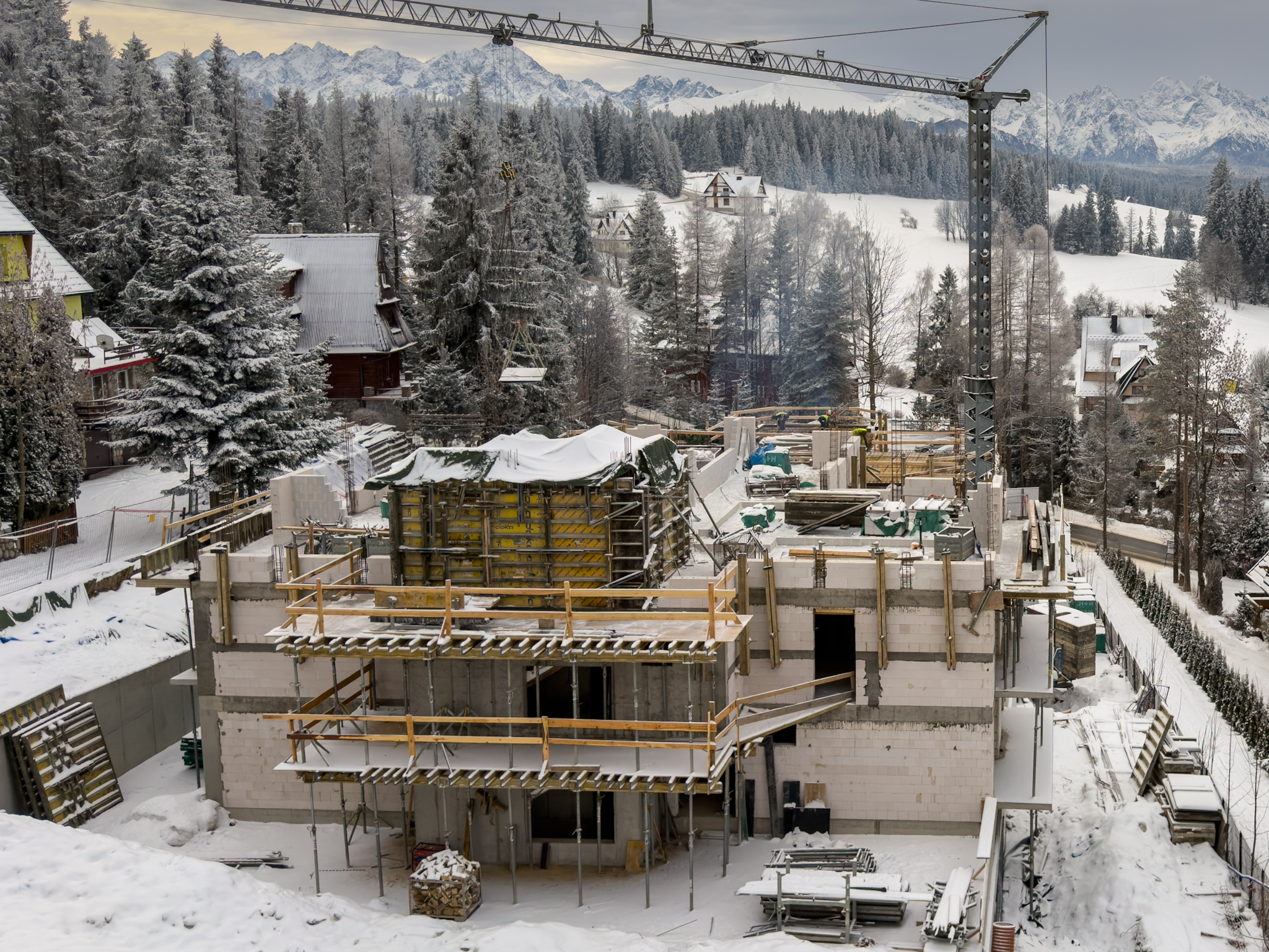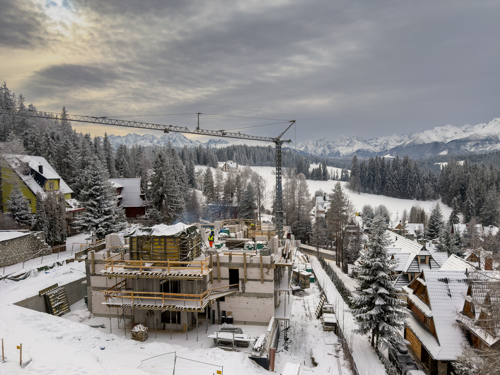 16 lutego przywitał nas świeżym śniegiem i mocnym mrozem — zima w tym roku tworzy tu naprawdę wyjątkowy klimat. Na budowie Apartamentów Rysy działamy jednak bez przerwy: prace postępują zgodnie z harmonogramem, a inwestycja z dnia na dzień nabiera coraz wyraźniejszych kształtów.